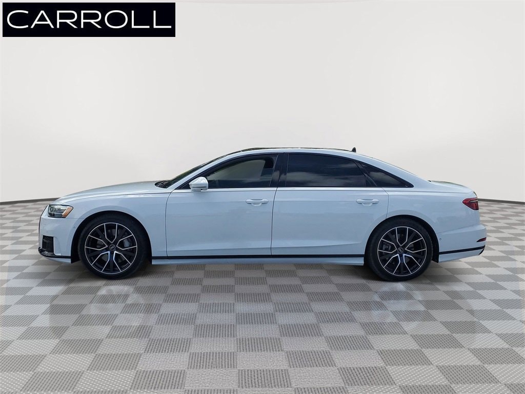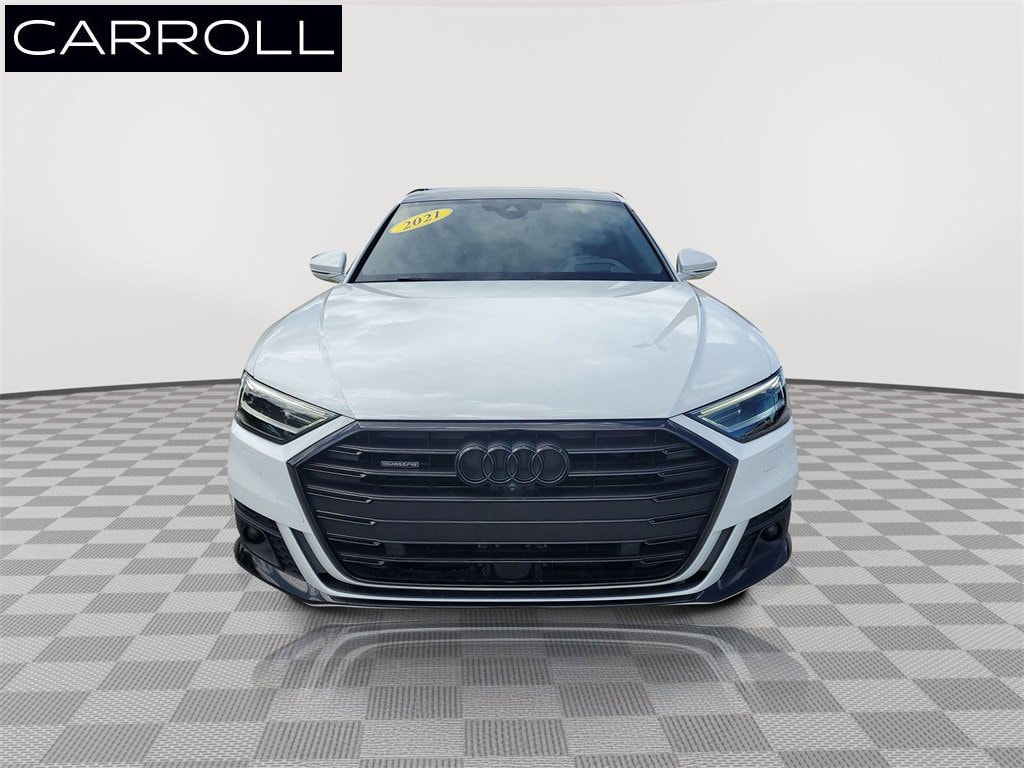 Glacier White 2021 Audi A8 L 55 quattro quattro 8-Speed Automatic with Tiptronic 3.0L V6 Turbocharged DOHC 24V LEV3-ULEV70 335hp Black Leather, 22-Way Heated Multi-Contour Comfort Front Seats, Adaptive suspension, Audi smartphone interface (Apple CarPlay/Android Auto), Auto-leveling suspension, Navigation system: MMI Navigation plus, Power 2nd-Row Moonroof, Power moonroof, Speed-sensing steering, Traction control, Turn signal indicator mirrors.
